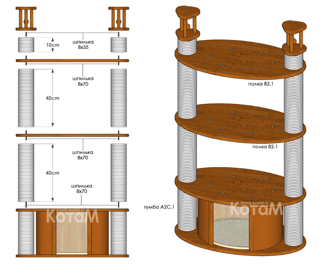 Удобный и компактный набор мебели для кошек и собак небольших пород. Не занимает много пространства, имеет несколько уютных мест для Ваших питомцев. Включает в себя полку с подушкой, уютную просторную тумбу и окончание с подвижным элементом для игры.