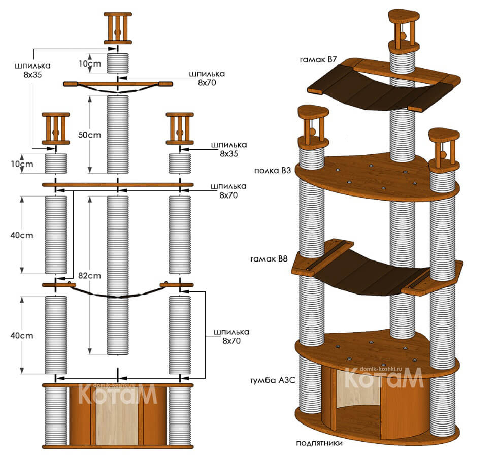 Игровой комплекс для кошек с двумя лежанками, домиком, двумя гамаками и канатом "Нокс"