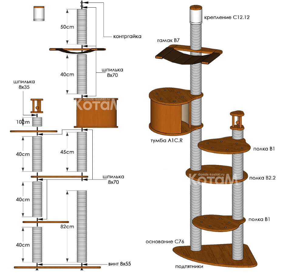 Удобный и компактный набор мебели для кошек и собак небольших пород. Не занимает много пространства, имеет несколько уютных мест для Ваших питомцев. Включает в себя полку с подушкой, уютную просторную тумбу и окончание с подвижным элементом для игры.