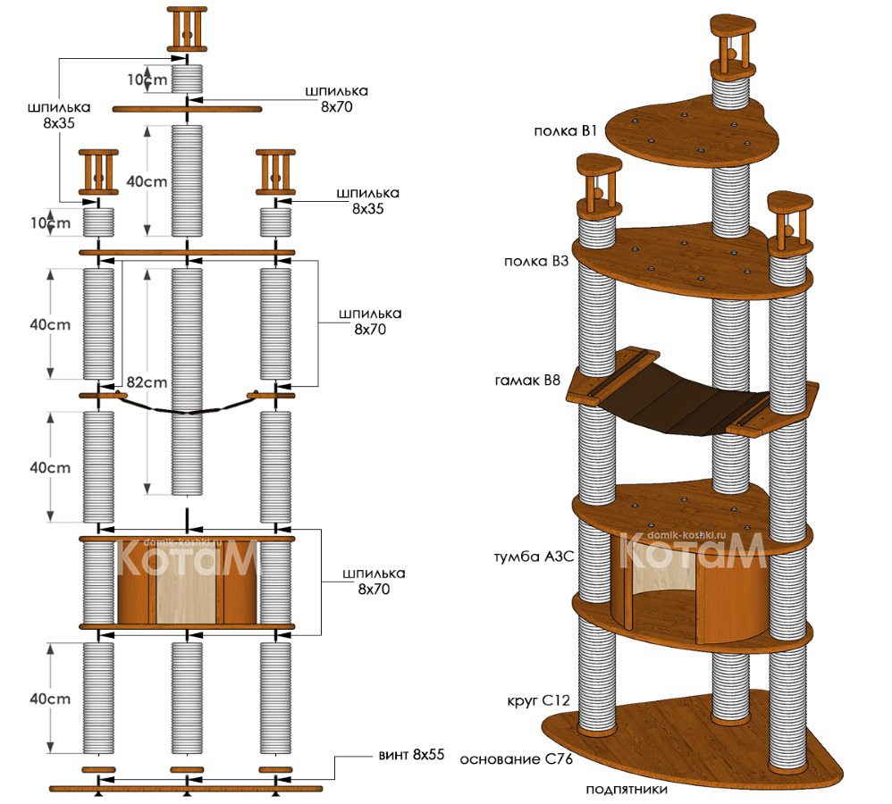 Высокий игровой комплекс для кошек с тремя лежанками, домиком, гамаком и канатом "Престиж"