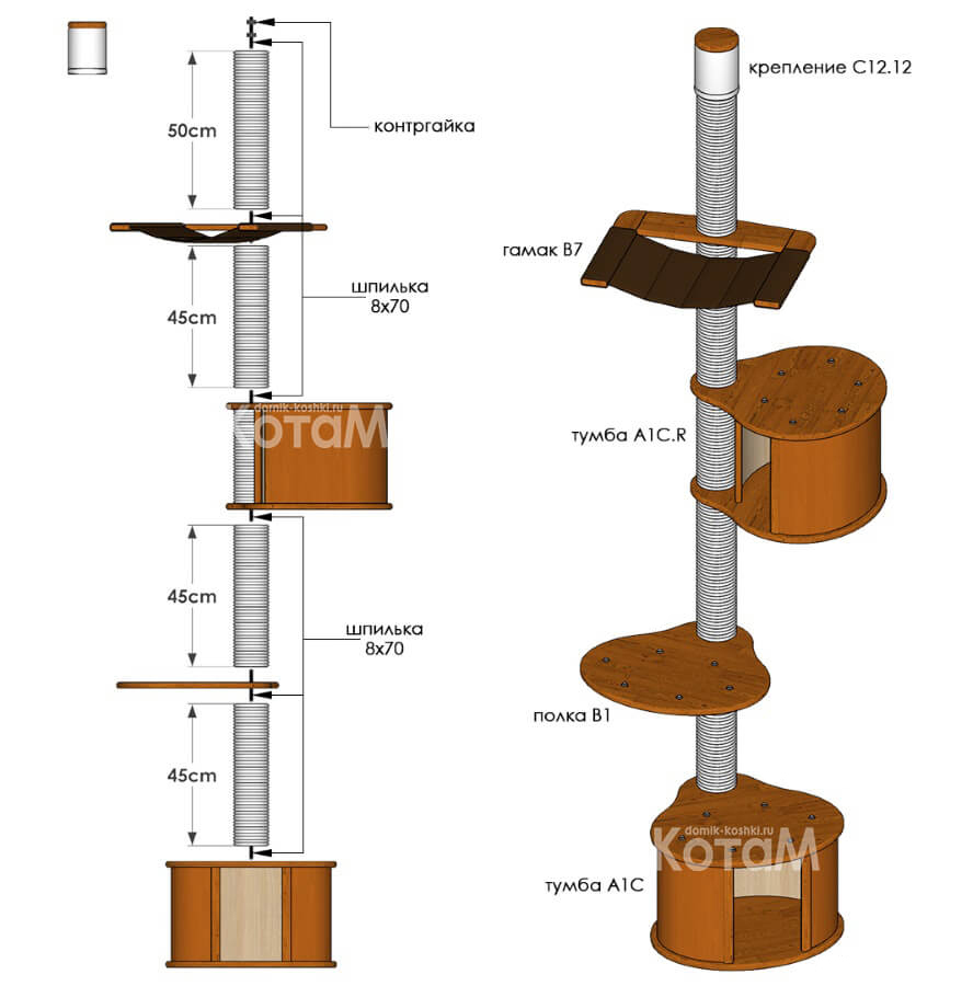 Удобный и компактный набор мебели для кошек и собак небольших пород. Не занимает много пространства, имеет несколько уютных мест для Ваших питомцев. Включает в себя полку с подушкой, уютную просторную тумбу и окончание с подвижным элементом для игры.