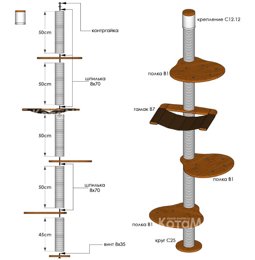 Компактный, многоместный комплекс для кошек, с надежным креплением к потолку. Не занимает много пространства в помещении. Удобно располагается как вдоль стены, так и в углу помещения. Подходит для одного или нескольких животных. Включает в себя усиленные столбы, гамак, полки с подушками и канат.
