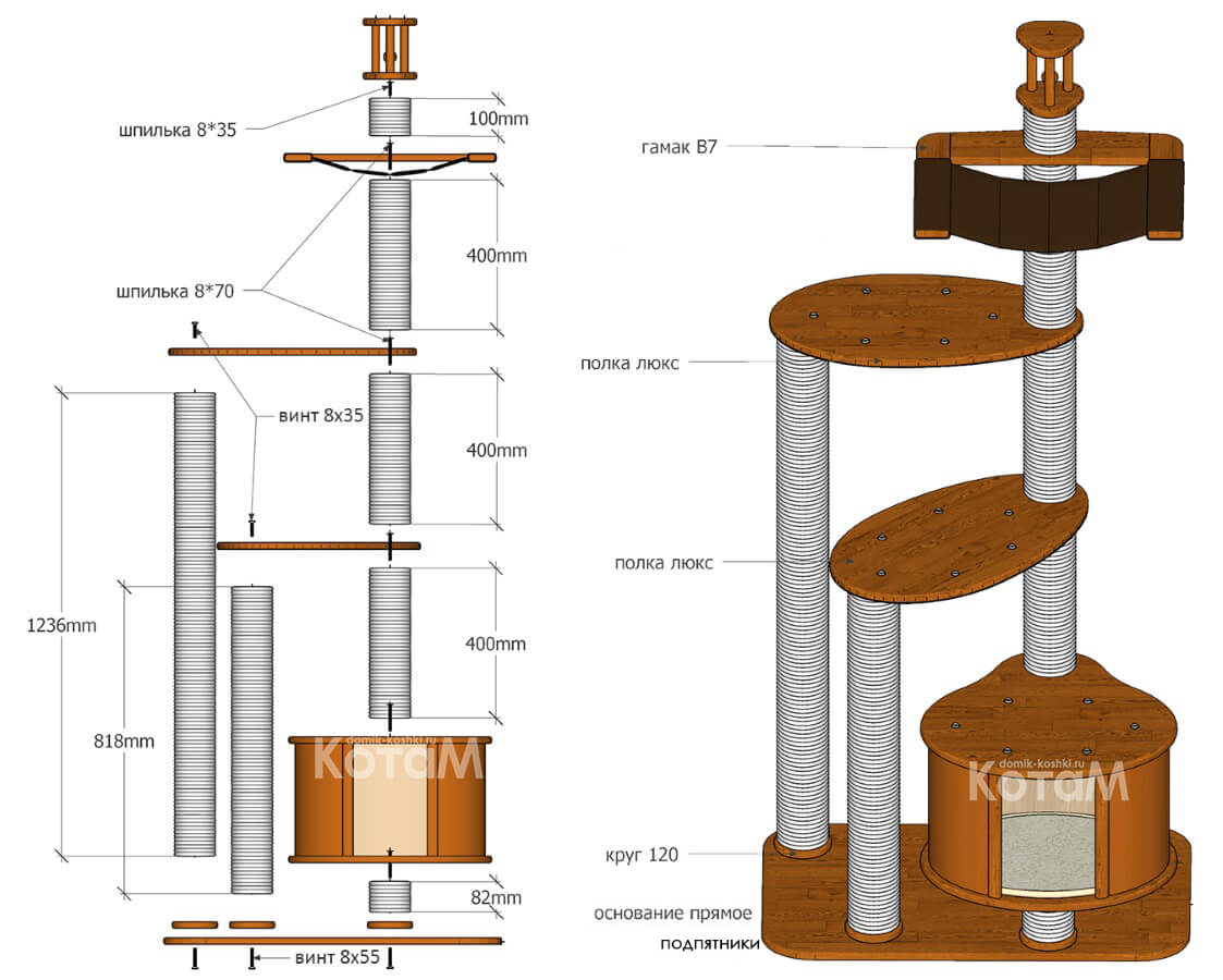Игровой комплекс для кошек с тремя лежанками, домиком, гамаком и канатом "Акси"