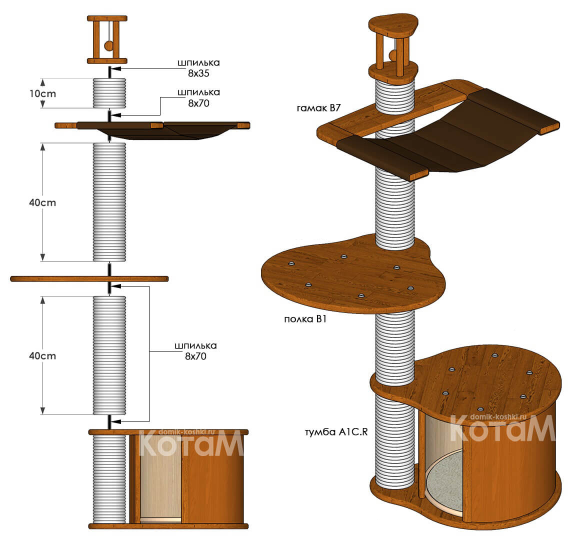 Игровой комплекс для кошек с двумя лежанками, домиком, гамаком и канатом "Берта"