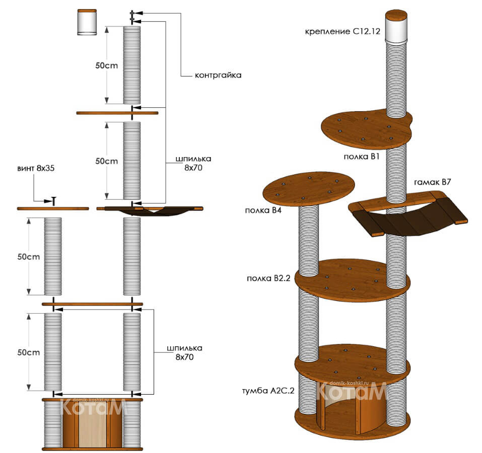Высокий игровой комплекс для кошек с тремя лежанками, домиком, гамаком, ступенькой и канатом "Дана"