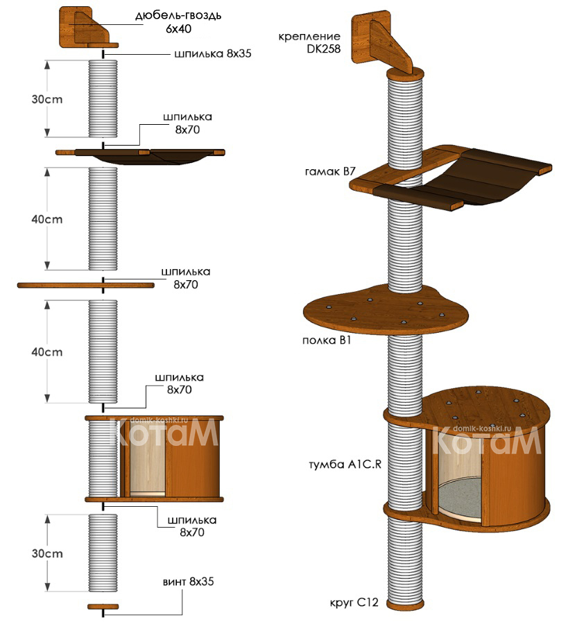 Удобный и компактный набор мебели для кошек и собак небольших пород. Не занимает много пространства, имеет несколько уютных мест для Ваших питомцев. Включает в себя полку с подушкой, уютную просторную тумбу и окончание с подвижным элементом для игры.