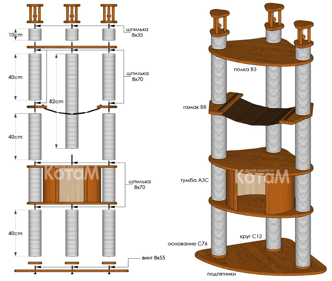 Игровой комплекс для кошек с двумя лежанками, домиком, гамаком и канатом "Кэмерон"