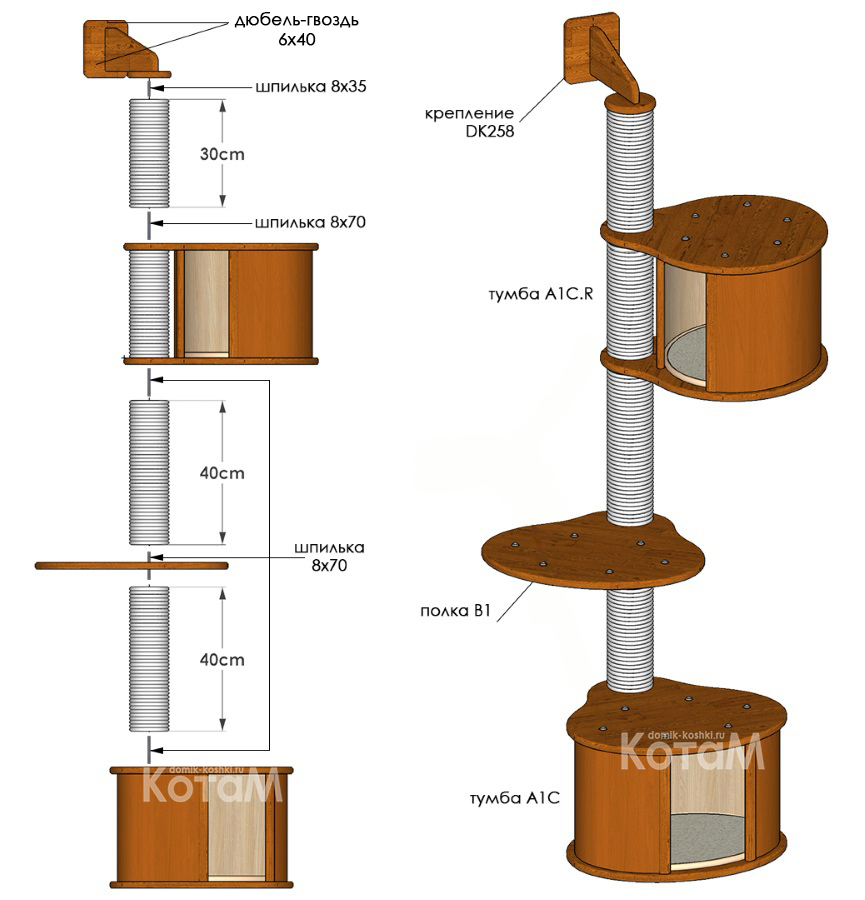 Удобный и компактный набор мебели для кошек и собак небольших пород. Не занимает много пространства, имеет несколько уютных мест для Ваших питомцев. Включает в себя полку с подушкой, уютную просторную тумбу и окончание с подвижным элементом для игры.