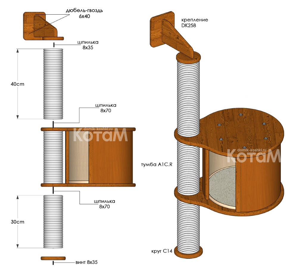 Удобный, компактный набор мебели, с надежным креплением к стене. Не занимает много пространства в помещении, имеет несколько удобных мест для расположения Вашего питомца. Подойдет как для одного, так и для нескольких животных. Включает в себя полку с подушкой, усиленные столбы, уютную просторную тумбу.