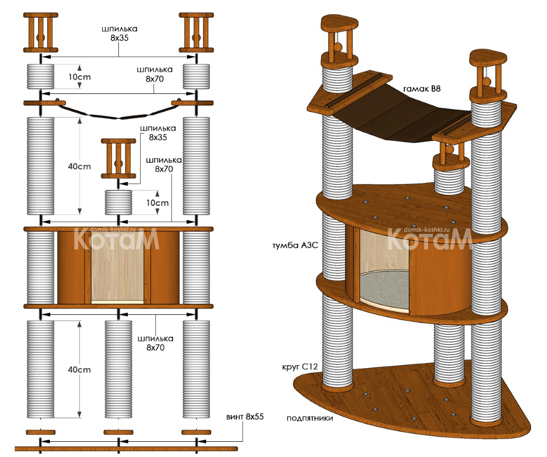 Игровой комплекс для кошек с двумя лежанками, домиком, гамаком и канатом "Бакарди"